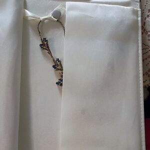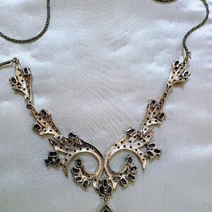 This is a vintage large Victorian style statement piece with genuine blue sapphires and marcasite cubic zirconia accents. The approx length is 19" and the width of the plate is about 5" and the clasp is marked. The main plate has 2 smaller attached wings on each side for some flexibility and comfort. It comes with the original padded satin folder with 2 snaps to keep it in place. There are 2 scuff marks on the front of the jewelry holder.