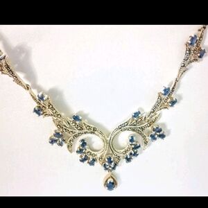 925 Genuine Blue Sapphire 28 Stones Marcasite Victorian Style Necklace 19"X5"