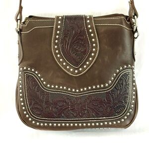 Stylish brown genuine leather with floral embossed pattern crossbody bag by Montana West. Features studded accents and adjustable strap.