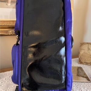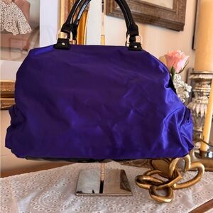 This purple satchel or tote bag appears to be made of nylon or a similar technical fabric, featuring black patent leather handles and silver-tone hardware. The style, with multiple exterior zippered pockets, resembles designs by brands like Liz Claiborne.