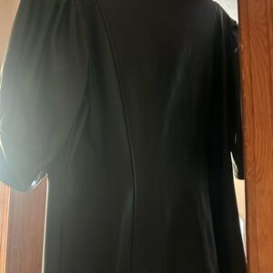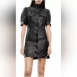 Chic black faux leather dress with snap front. Features short puff sleeves and chest pockets.