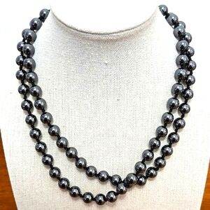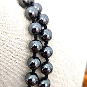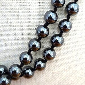 These black hematite beads are hand knotted. No clasp on this piece. 14.5" drop length. Beautiful heavy, cold beads. Fast shipping and careful packaging. (N)