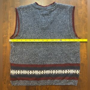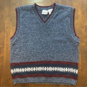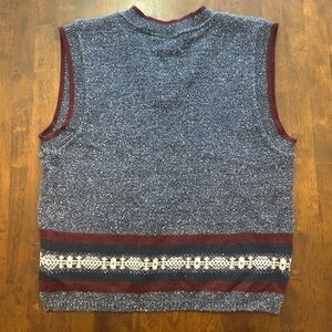 Classic V-neck sweater vest by Arizona Jean Company. Features a blue base with burgundy accents. Ideal for layering. Size Medium.