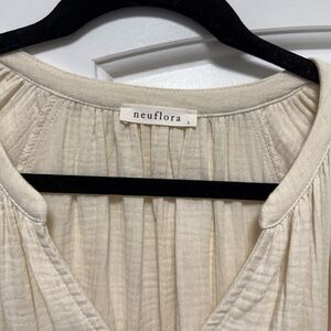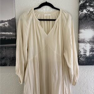 This chic cream dress features long sleeves and a flowing silhouette, perfect for any occasion. Its elegant design offers both comfort and style. Made with 100% cotton, very flattering shape, super soft material. Would be amazing for maternity clothes as well. This dress also has pockets!! Dress is a bit sheer so will need a slip underneath.