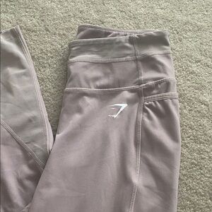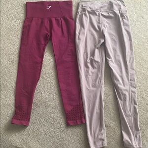 2pair workout leggings by Gymshark both are medium. Inside size tag removed from lighter pair. Lighter pair ha mesh panels on lower leg. And has pockets wine colored pair has cutout designs. Both are in great condition!