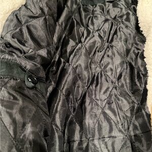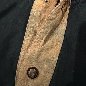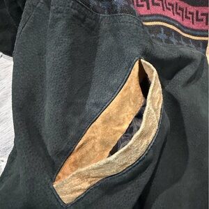 Stay warm and stylish with this vintage genuine suede leather jacket featuring a unique south west geometric Aztec Navajo pattern. The jacket combines earthy tones with a cozy sherpa & quilt lining, perfect for any casual outing. Has some discoloration on the tan part of the leather. Buttons are a little loose fitting but does button up. This is a preowned vintage item please don’t expect like new unless stated otherwise. See pics for more details and approximate measurements . I do my best detailing everything I know or discover. Priced accordingly but offers are always welcome