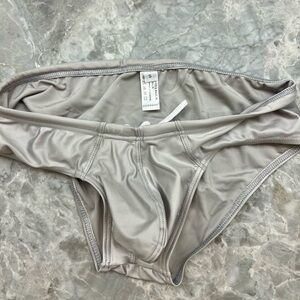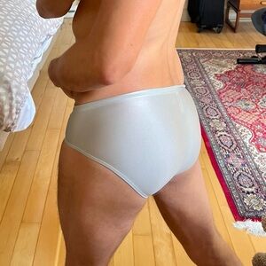 Dive into style with these sleek silver swim trunks. Gloss Satin Collection fabric provides a smooth form-fitting silhouette. Perfect for a day at the beach or pool. Excellent condition with no tags. Transparent when wet.