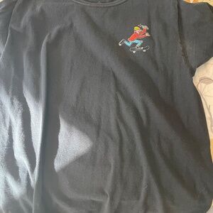 Empyre "Push Run, Skate Getaway" Black Graphic T-Shirt- Size Large. It is in very good condition. The graphics are in good condition. It does have the t-shirt black coming through the design, but it still looks good.