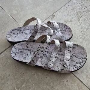SAS Iskia Pink Snake Print Leather Slide Sandals Slip On 3 Strap SZ 8M US. Gently worn little signs of use. Great tread and Velcro straps with silver toned embellishments. Very faint pink faux snakeskin. Super comfy sandals.