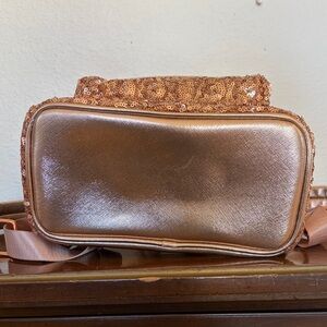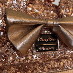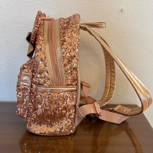 Sparkling rose gold sequin mini backpack with Minnie Mouse ears and bow. Older heart logo. Fun polka dot lining. Very good condition, matching ear and in My closet too!