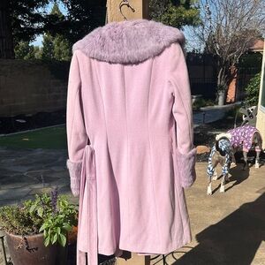 Chic teddy jacket with plush fur trim. Soft purple hue adds elegance. Perfect for stylish layering. It does have a small stain in the inside and back of jacket. Under label (see pics). Stitching on right side that holds belt is ripped. Easy sewing will fix. But other than that, I’m pretty good shape. Will look at all offers. ☺️ Coat length about 40” long