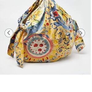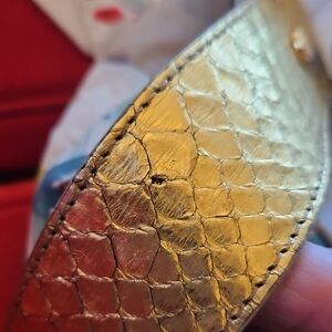 Vibrant floral design. Gold snakeskin leather handle accent. Spacious and stylish.