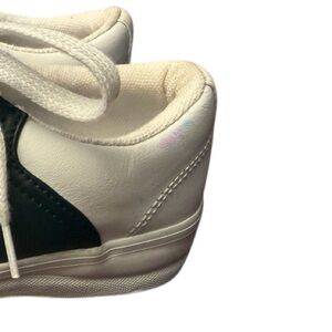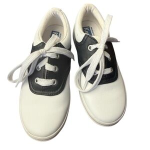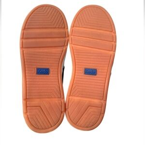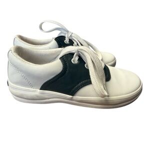 Classic Keds sneakers for kids with a saddle shoe design, perfect for school or play. These navy and white sneakers are in near excellent condition. There is a little bit of dirt on the exterior rubber of the shoe as shown in the pictures. If you can’t see it in the pictures, then you’ll know that it’s not that noticeable at all. They’re also is a little like scuff that is kind of a purple yellow color by the ankle on the left shoe. Also shown in pictures. Not that noticeable. Other than that, these are in excellent, barely used condition in a girl’s size 12 M. All of my items are well cared for and come from a clean and smoke free home.