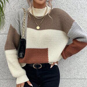Elevate your late fall wardrobe with this casual, long sleeve sweater. Featuring a multicolor colorblock design, a comfortable loose fit, and a practical stand collar, this pullover is perfect for everyday wear. Its drop shoulder and regular hem ensure a relaxed silhouette.