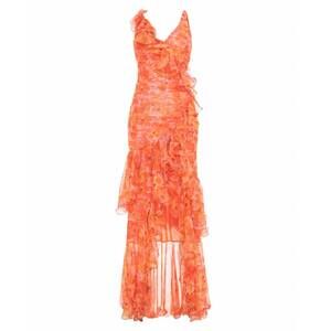 The PatBo Myosotis Flutter Gown in yellow is a stunning sleeveless maxi dress perfect for a cocktail party. Crafted in Brazil, this gown showcases a vibrant floral pattern on midweight mesh fabric with an asymmetric hem for a boho chic look. It features a hidden back zip closure, a ruffle design at the trims, and is fully lined for added comfort. Composed of a 95.5% cotton and 4.5% elastane blend with a lining of 95% polyester and 5% elastane, this dress requires hand washing and line drying to maintain its beauty.