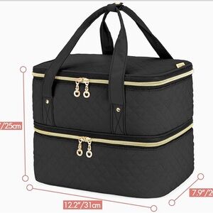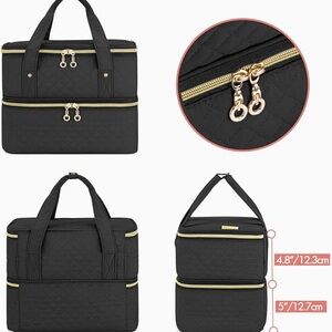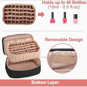 Stylish black quilted organizer for nail polish. Features multiple compartments and a zip closure.