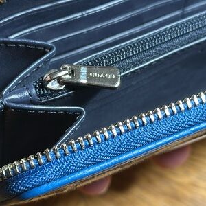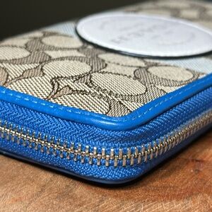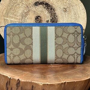 Line New condition Coach Dempsey Signature Stripe Patch Accordion Zip Wallet. Tan/Brown Signature canvas with chalk Coach patch, pale green and silverish stripes. This wallet is trimmed in blue leather and blue fabric. Hardware is silver. Inside is a refined midnight blue calf leather with 12 card slots, 2 bill pockets, and zippered coin pocket. The wallet has no flaws and looks almost unused. Size 7 1/2” x 4”