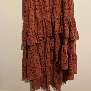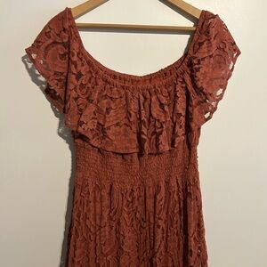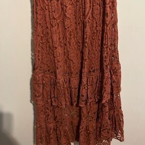 Shyanne high low dress with lace detail. Off the shoulder. Color is a pink terracotta shade.