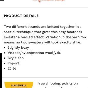 Madewell boatneck sweater in a gorgeous mixed thread cream and light orange/peach. Merino wool/viscose/Mohair/Yak hair. Boxy oversized fit. Excellent gently worn condition with no flaws.