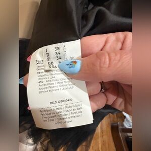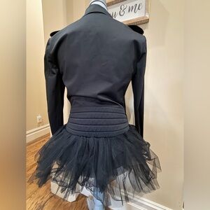 Super cute Moschino Couture Jacket with Tulle Fringe around the base of it, in very gently used condition. Is Material not leather. Material tag is in the photos. Size 4 US. Thanks for looking!