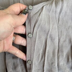 Elegant taupe cardigan. Short sleeves with button front. Lightweight and versatile.