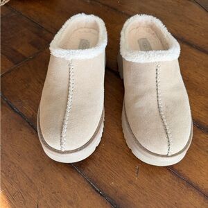Experience cozy style with UGG tan suede mules. Ideal for everyday wear. Worn once. Runs big. Very comfortable.