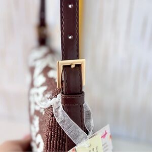 Newly released handmade beaded shoulder bag with major Y2K energy. Intricately beaded with a brown and white floral pattern, this piece channels early-2000s baguette silhouettes with elevated, artisan craftsmanship.