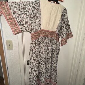 Chic Zara maxi dress with floral pattern. Features beige and red hues. Perfect for a bohemian look.