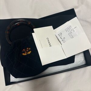 This black suede calfskin pouch is embellished with a handle and tortoiseshell-patterned double C.