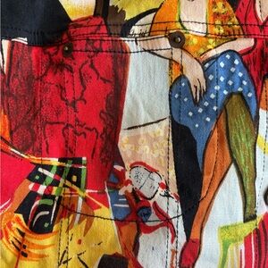 Artistic button-up jacket by Kaktus with three quarter sleeves and two pockets on the front. Features vibrant patterns with a mix of colors. Parisian and European scenes rendered in partial abstract. Perfect lightweight jacket for spring and summer.