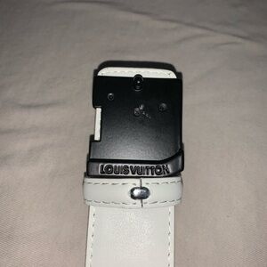Elegant Louis Vuitton belt in ivory. Features a striking charcoal logo buckle. Adds sophistication to any ensemble.