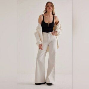 Features: Stretch denim fabric in an off white ivory color. High waist. Wide leg. Pockets. Zip to button closure