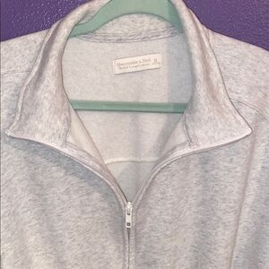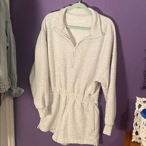 Abercrombie & Fitch light grey half-zip sweatshirt romper from The A&F Lounge Collection. It features long sleeves with cuffs, a collared neckline, a half-zip front, and an elasticated waist with pockets.