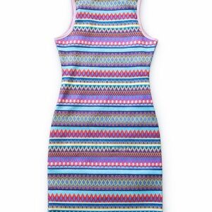 Beautiful multicolor bodycon tank dress featuring a vibrant boho/tribal geometric print. Made from soft, stretchy fabric for a flattering and comfortable fit. Sleeveless with a scoop neckline and pink trim accents. Perfect for summer, vacations, festivals, brunch, date nights, or casual wear.