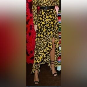 Elevate your wardrobe with this elegant high-low skirt. Featuring a striking yellow and black floral design, it's perfect for any occasion.