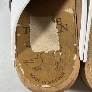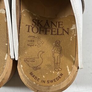 These SKANE TOFFELN Sweden clogs shoes in size 41 are a unique and stylish addition to any woman's wardrobe. Handmade with floral painted leather, these comfortable clogs showcase a beige color and a charming clog style. Made in Sweden, these shoes combine quality craftsmanship with a fashionable design, making them perfect for casual wear. Stand out from the crowd with these one-of-a-kind clogs that are sure to add a touch of sophistication to any outfit. Some scuffs on the soles.