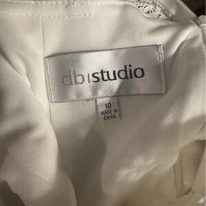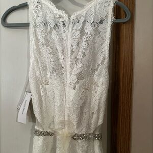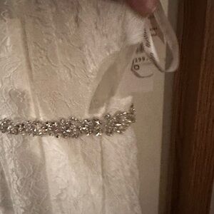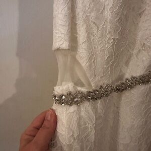 This elegant white lace dress is perfect for any special occasion. Its intricate lace design adds a touch of sophistication and style. Gorgeous dress, pictures don’t do it justice. Belt alone was 100.00.