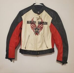 Stylish Harley-Davidson leather jacket with bold red and black accents. Features iconic logo and design.