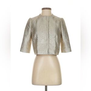 Elevated and timeless, this Max Mara Pianoforte metallic brocade jacket is a rare couture-quality piece crafted in Italy. Features a stunning silver-blue geometric brocade with champagne metallic threads and a beautifully structured cropped silhouette. Fully lined in 100% silk for an exceptionally refined finish.