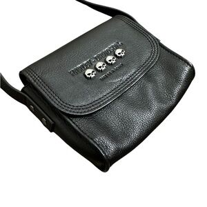 Compact black leather bag with iconic Harley-Davidson branding and skull accents