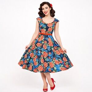 Lindy Bop Blue and Orange Floral Retro Silhouette Style Pin Up Fit & Flare Dress