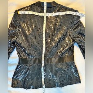 Stunning sequin and satin jacket by Musani Couture. A truly exceptional way to bring the glam and elegance. This piece is in excellent condition. The jewelled front clasp features 2 hook and eye closures as well as one dome type. Fully lined. See photos for lay flat measurements and feel free to ask questions.