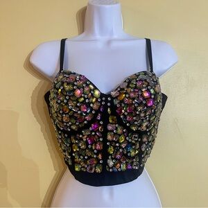 Sultry Multi-Color Mixed Rhinestone Embellished Bustier Crop Top - Size Large