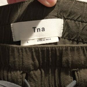 Tna Aritzia 100% rayon joggers, size L. Olive green colored. Elastic waist with drawstring. Pockets on the hips. Very soft and comfortable. There is a small pull on the rear seam, please see photo. Otherwise in good condition.