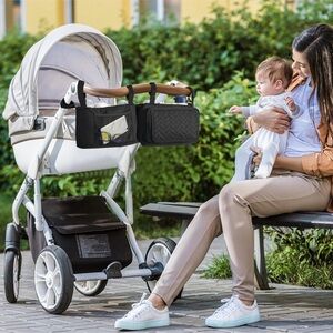 Convenient black stroller organizer with multiple compartments and cup holders. Perfect for keeping essentials within reach.