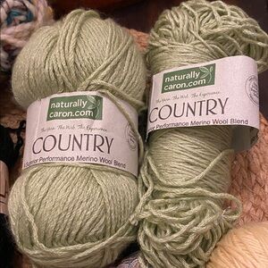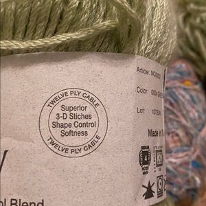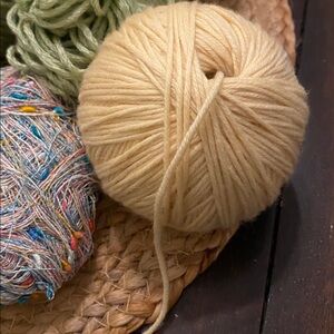 Assorted yarn bundle including merino wool and very thin variegated thread yarn. Wool Ease, mohair blend, acrylic, and cotton/acrylic blend