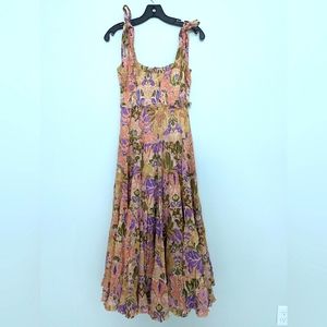 Elegant off-shoulder dress. Features a smocked bodice. Flowy skirt design.