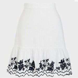 Chic white skirt with intricate navy blue floral design. Ideal for versatile styling.