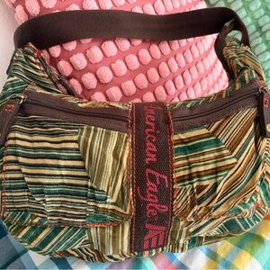 1- Stylish corduroy bag with a mix of red, green, and brown by American Eagles. 70s vibes. Tiny hole see pic.