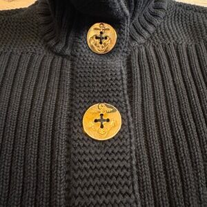 Wrap yourself in classic coastal charm with this Lauren Jeans Company Ralph Lauren cardigan. The black hue and substantial ribbed knit create a cozy yet sophisticated silhouette, perfect for layering. Striking gold-tone buttons featuring a nautical anchor motif add a distinctive maritime flair, while the generous shawl collar offers warmth and timeless style. Ideal for brisk seaside strolls, casual weekend brunches, or adding a touch of preppy elegance to your everyday look.